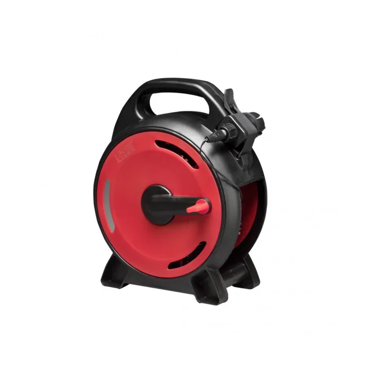 - Durable black and red cable reel design for easy storage and deployment
